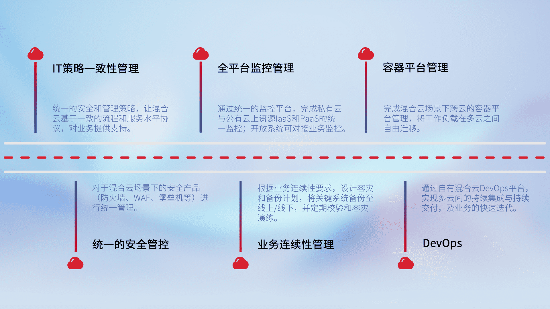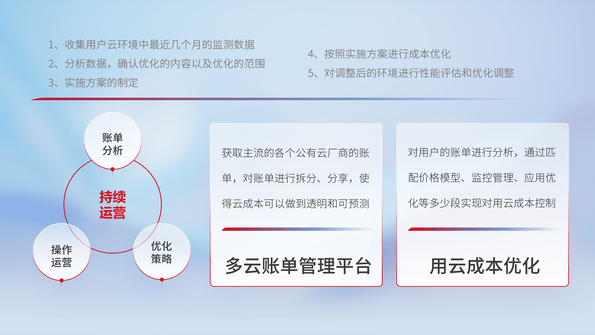 通过多云纳管,,以统一的资源数据模型把客户的云资源进行抽象和封装,,,进而实现对多云资源的统一操作,,保障云资源管理的可靠性、、稳定性与可用性。。。。量身定制化运维内容,,,,配置、、、、开发运维、、、补丁管理、、备份、、监控、、、、认证和访问管理、、、、审计和日常巡检等,,,保障在用云过程中的可靠度,,稳定度以及高可用率。。。。