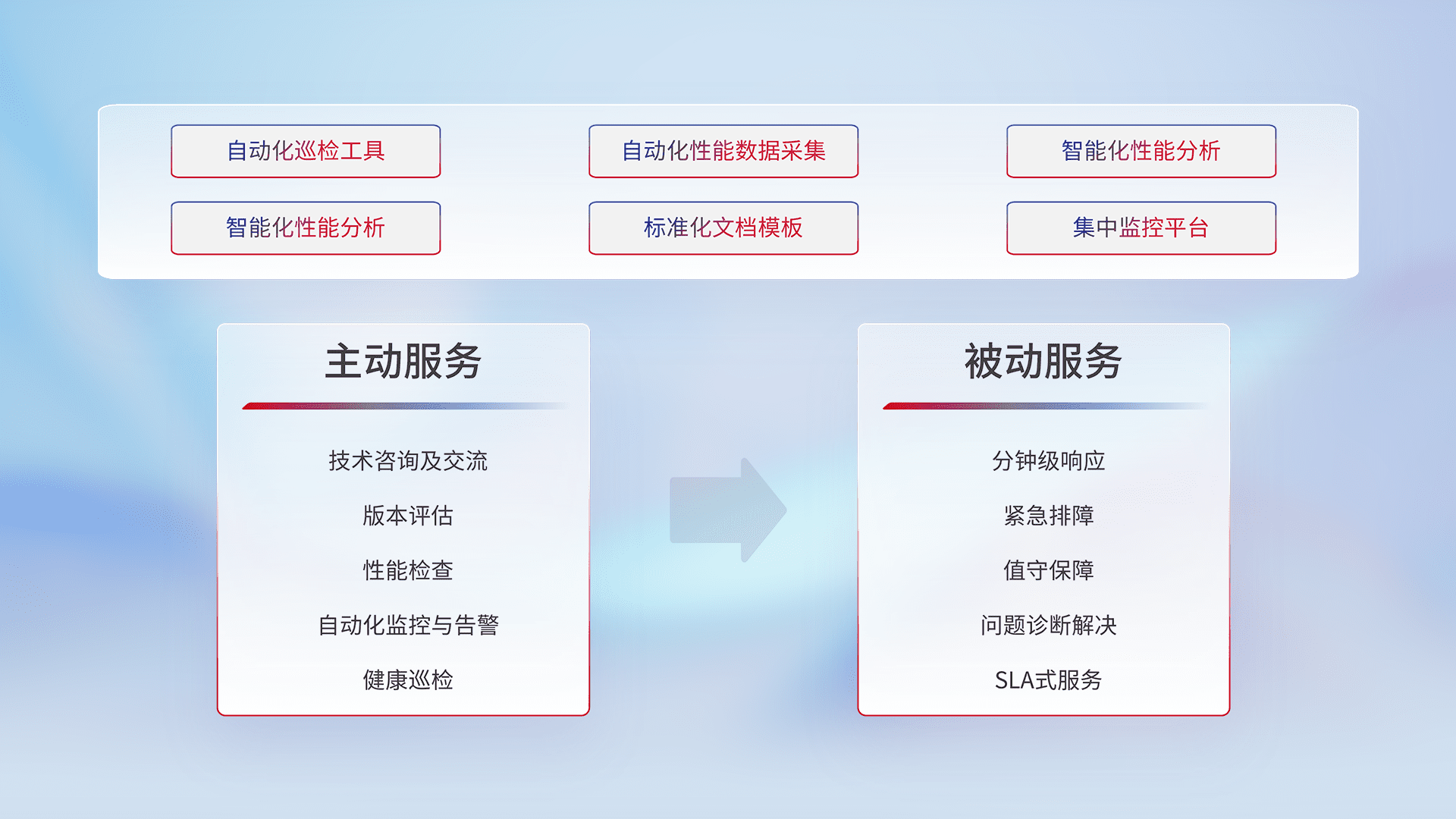 智能化工具和标准化文档,,,保障服务质量,,,,提供主动服务(包含技术咨询、、、、版本评估、、、性能检查、、、自动化监控与告警、、健康巡检)和被动服务包含(分钟级响应、、、、紧急排障、、、值守保障、、、问题诊断解决、、SLA服务)。。。